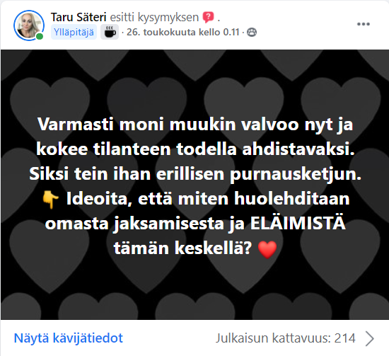 - Tämä väite ei pidä paikkaansa. Koko keskustelu on edelleen luettavissa vapaaehtoisillemme tarkoitetussa ryhmässä. Keskustelusta on nähtävissä kaikki kommenttini, eikä niiden sisältö ole tämän väitteen mukainen. Ryhmässä on noin 300 yhdistyksen vapaaehtoista. Olen varapuheenjohtajan roolissa huolehtinut osaltani vapaaehtoistemme jaksamisesta ja pitänyt huolen siitä, ettei kukaan jää yksin tämän järkyttävän tragedian keskellä. Olen itsekin nuori nainen, kuten suurin osa vapaaehtoisistamme, joten tilanne on sitä kautta meille henkilökohtaisellakin tasolla raskas. Olemme yhdessä pyrkineet kantamaan huolta itsestämme, toisistamme ja siitä, miten tämä kaikki vaikuttaa eläinsuojelun toteutumiseen. Vapaaehtoistemme ryhmässä käydyssä keskustelussa olemme käyneet läpi mm. sitä, että miten voimme jokainen huolehtia omasta jaksamisestamme ja ennen kaikkea eläimistä tämän tilanteen keskellä. Tässä myös linkki henkilökohtaiseen kirjoitukseeni, missä kerron omista ajatuksistani: https://tarusateri.fi/2021/05/28/naantalin-hevostalli/