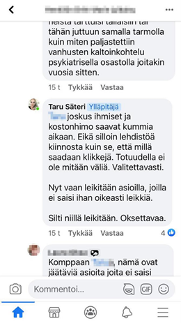- TS:n julkaistua selvityksensä SR Tallista 24.5. verkkolehdessä ja 25.5. printtilehdessä, ruodit uutista Tesyn suljetussa Facebook-ryhmässä ja väitit useaan otteeseen uutisointia valheelliseksi. 26.5. jatkoit lehtijutun ruotimista saman sävyisillä kommenteilla.