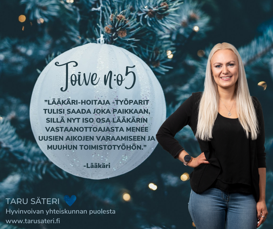 Kysyin eri terveydenhoidon pisteissä työskenneeltä lääkäriltä, että mikä toive hänellä olisi tulevalle hyvinvointialueelle. Hänen toiveensa oli lääkäri-hoitaja -työparien perustaminen, sillä nyt iso osa lääkärin vastaanottoajasta menee uusien aikojen varaamiseen ja muuhun toimistotyyppiseen työhön.